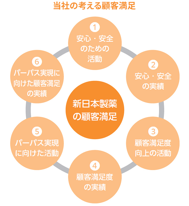 当社の考える顧客満足は、6つの指標からなり、それを達成していくことが新日本製薬の考えるお客さま満足の実現につながると考えています。