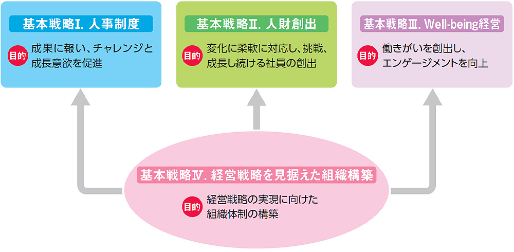 Health & Beautyの分野におけるリーディングカンパニーとなるため、今後の人財戦略として、「人事制度」、「人財創出」、「Well-being経営」の3つの側面から社員の挑戦・変化 ・ 成長及び積極的な人財登用を強く推進し、さらに、「経営戦略を見据えた組織と人員体制の構築」の実現を果たすことで、中期経営計画の実現に寄与してまいります。