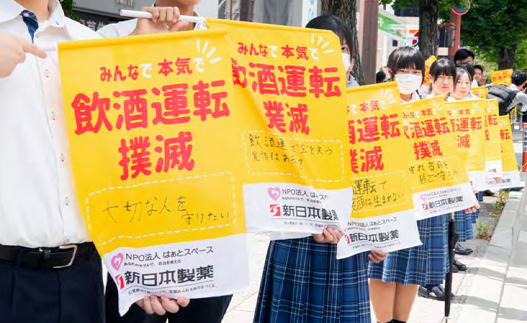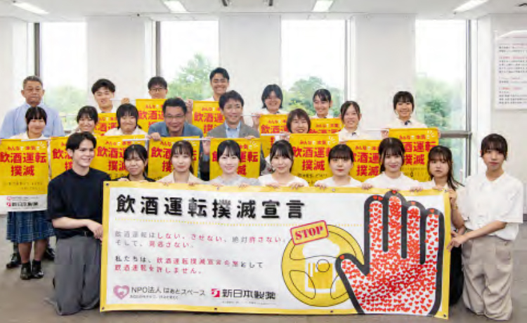 当社は、本社のある福岡県で2008年から飲酒運転撲滅運動に力を入れています。福岡海の中道大橋飲酒運転事故が発生して以来、県をあげて飲酒運転撲滅に取り組んでいますが、いまだ撲滅に至っていません。2024年度は飲酒運転撲滅活動に取り組むNPO法人はぁとスペースの理事長である山本氏の講演会を本社にて開催。同日には、飲酒運転撲滅への願いを書いた旗を、走行する車に対して掲げる「旗の波運動」を当社社員や協力団体と実施しました。