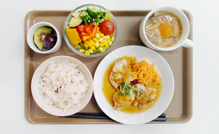 当社は、美と健康の「新しい」を提供する企業として、まずは社員の健康に寄与するため、本社ビル最上階にカフェテリア(社員食堂)を設けています。カフェテリアでは、管理栄養士の監修のもと、日替わりランチを「スマートランチ」として提供している他、数種類の日替わりメニューをリーズナブルに提供しております。「スマートランチ」は成人女性の1日に必要なエネルギー摂取量の1/3で設計されています。