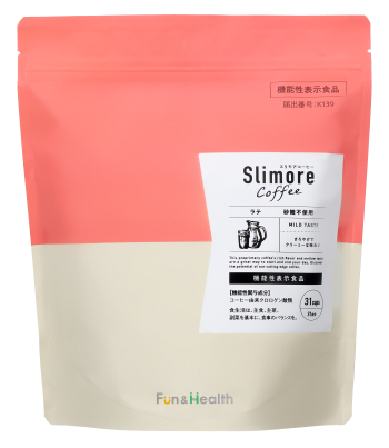 Slimore Coffee(スリモアコーヒー)同様、肥満気味の方の体重・内臓脂肪の減少をサポートする機能性関与成分であるコーヒー由来クロロゲン酸類を配合。コーヒー由来クロロゲン酸類は、コーヒー生豆に含まれているクロロゲン酸類であり、1日当たり180 mg以上摂取した場合、肥満気味の方の体重減少及び高めのBMIが改善することを確認しています。