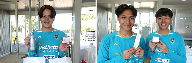 新日本製薬 株式会社(本社:福岡市、代表取締役社長CEO:後藤孝洋)は、アビスパ福岡株式会社(本社:福岡市、代表取締役社長:西野努)の選手・監督・コーチ・スタッフの皆さまへ『パーフェクトワン』商品1年分および、男性向けスキンケアブランド『TONOU(トノウ)』の新商品「トノウ 薬用デオドラントスカルプシャンプー」を贈呈いたしました。また、アビスパ福岡の北島選手と碓井選手に『TONOU』新商品をご体験いただきました。